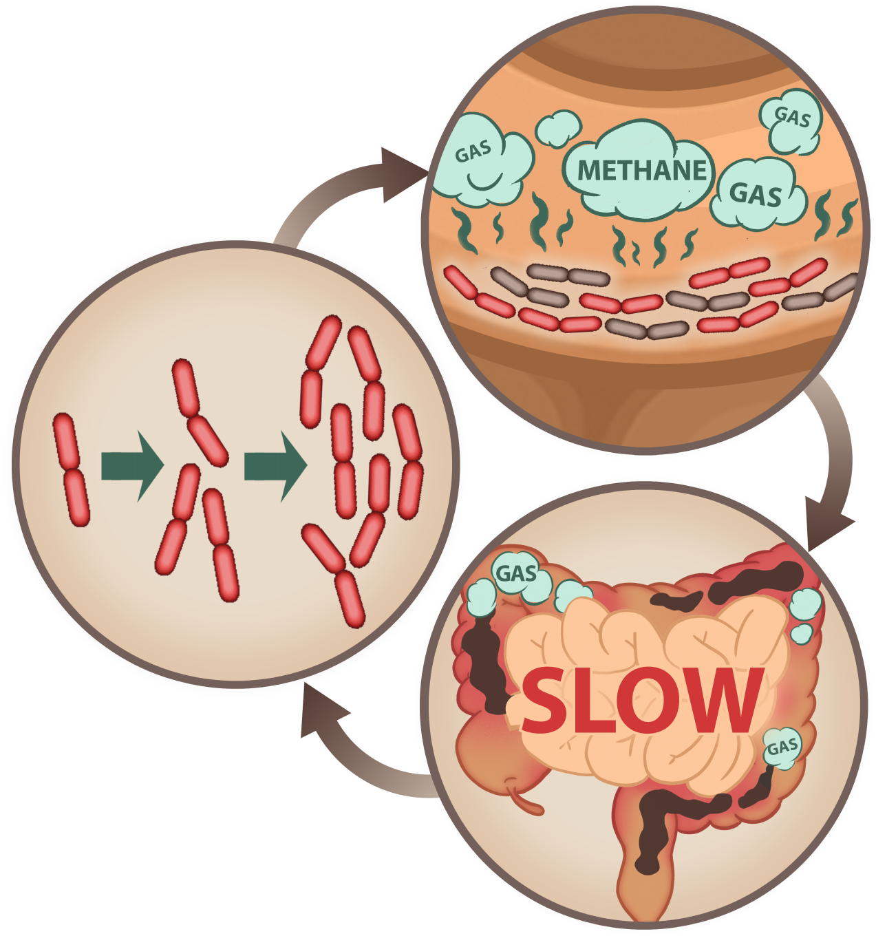 And the more archaea grow inside you, the more methane gas builds up in your body,slowing down your poop speed and causing constipation,bloating, painful cramps,and embarrassing gas.