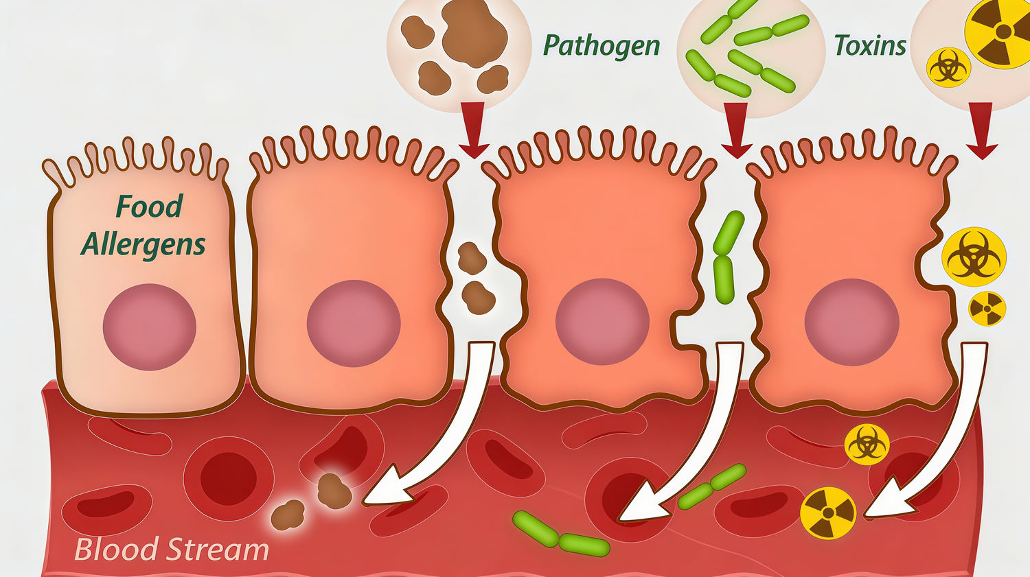 1. The intestinal lining has microscopic gaps between the cells, allowing food allergens,bacteria, and toxins to enter the bloodstream